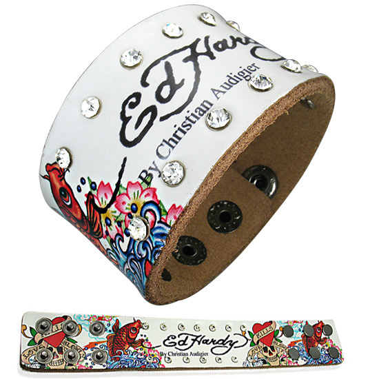 Ed Hardy embossed leather with tattoo print and adjustable snap closure. Proudly show off your passion for style with this cool Ed Hardy leather cuff bracelet.