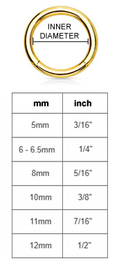Inner diameter refers to the diameter inside the hoops, rings, captives, or horseshoe rings.
