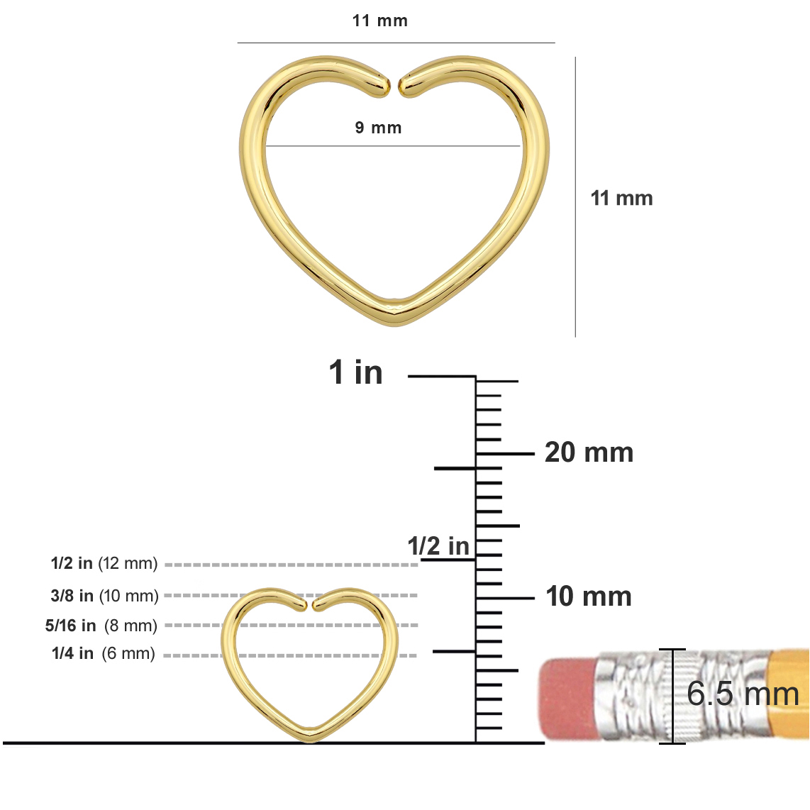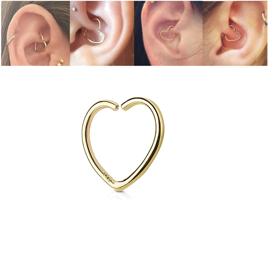 All our gold piercing jewelry is made of 14K solid gold (no vermeil, plated, or filled), material that is highly recommended by APP (Association of Professional Piercers). Gold higher than 18K is not adequate for body jewelry because it can easily be scratched or nicked. Q : How does the heart open? Do you have to bend it? A : Just twist a bit to open the ring. |