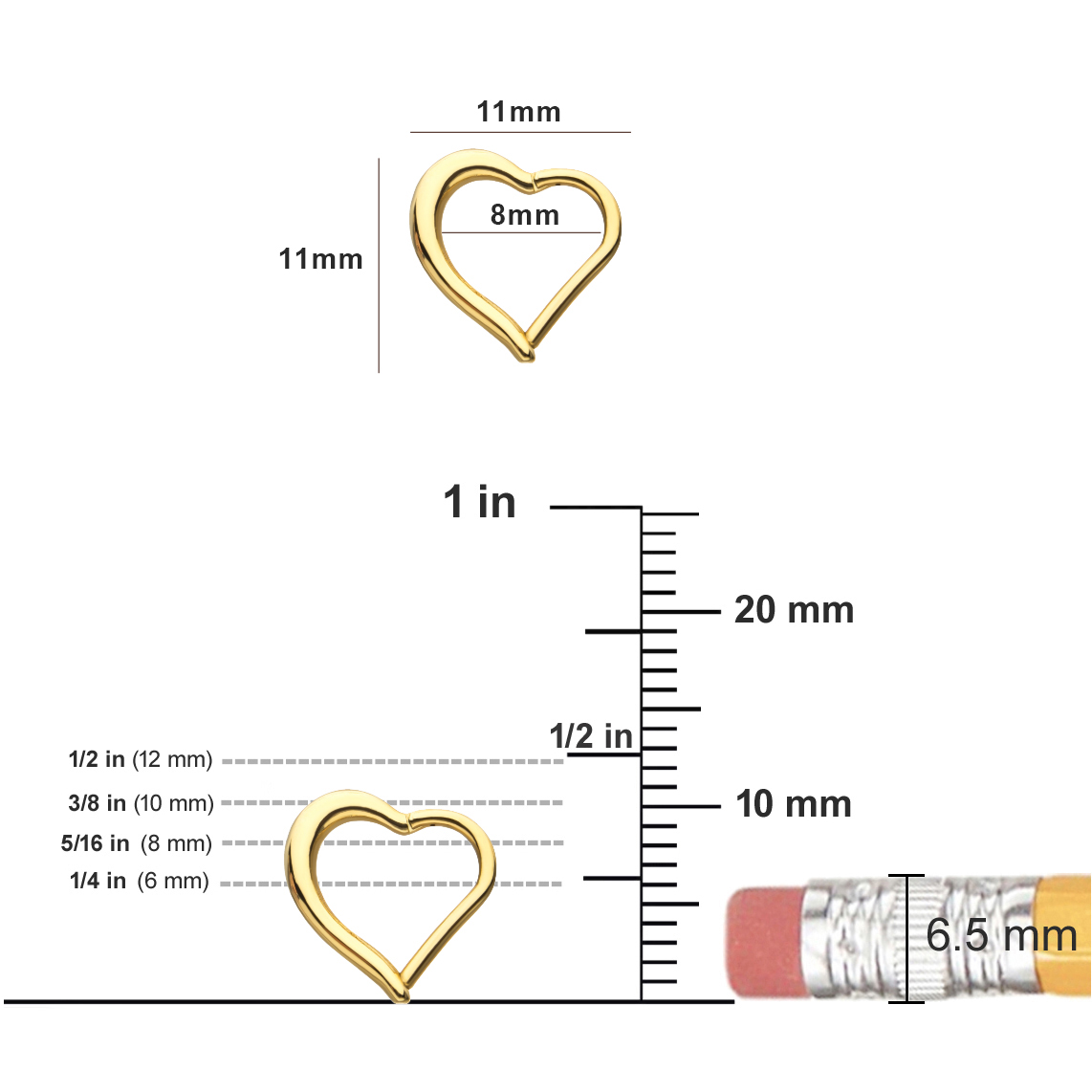 All our gold piercing jewelry is made of 14K solid gold (no vermeil, plated, or filled), material that is highly recommended by APP (Association of Professional Piercers). Gold higher than 18K is not adequate for body jewelry because it can easily be scratched or nicked. Q : Will you be getting the white gold left ear back in if yes do you know when? A : Yes, it's currently in production and it will be available by the end of this month, June 30, 2019. Q : I just recently purchased the white gold left ear' and I am unsure of how to open it. I don't want to break it! Can you please send me a video to my email? Or any other way of demonstrating this? A : Please see the 4th picture from the product page or see the link to a photo below. https://s.turbifycdn.com/aah/yhst-4673793187882/14k-gold-open-heart-seamless-16g-clicker-ring-daith-rook-helix-3.jpg Q : Will you be getting the yellow gold left ear soon? A : No, this item will be discontinued once it's sold out. |