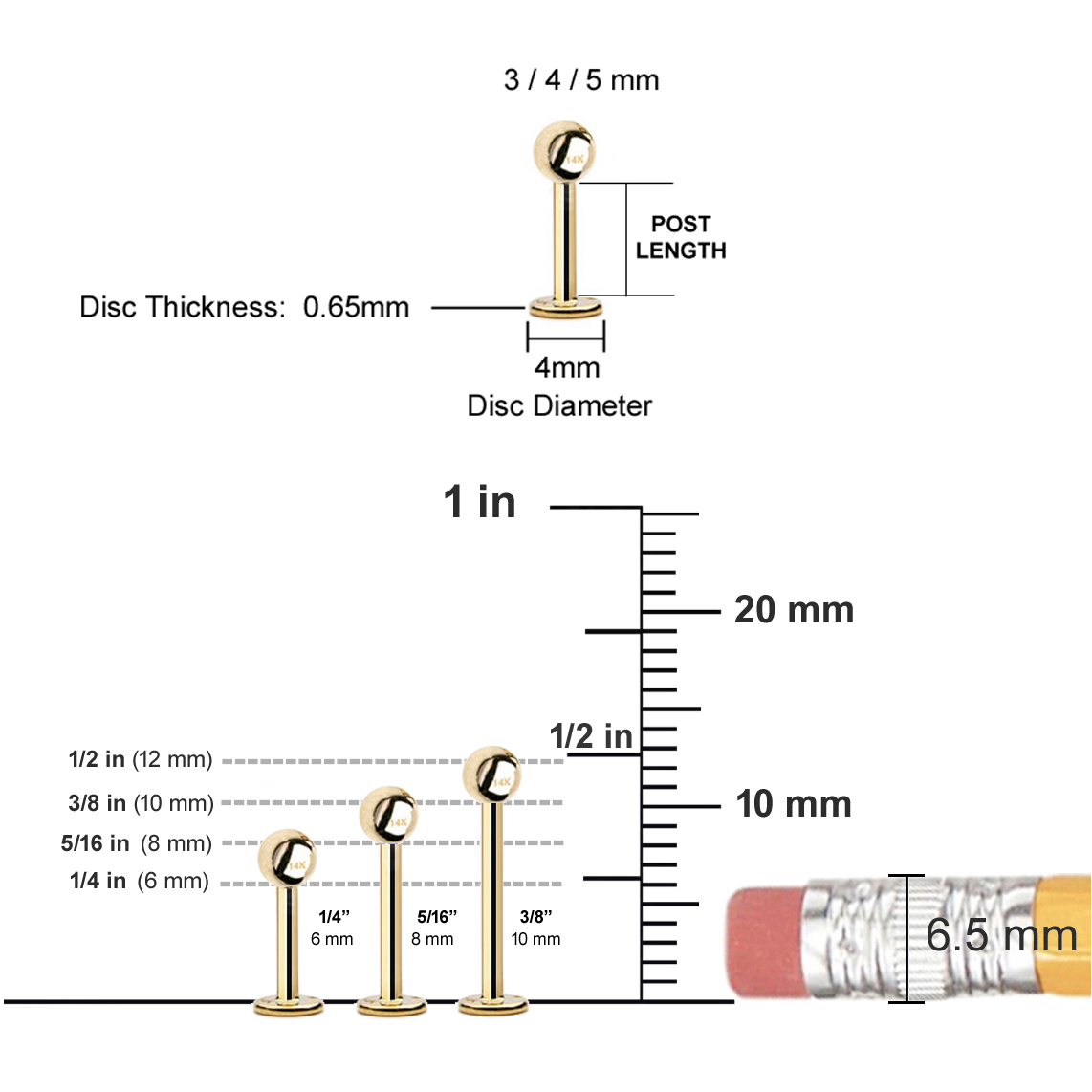 All our gold piercing jewelry is made of 14K solid gold (no vermeil, plated, or filled), material that is highly recommended by APP (Association of Professional Piercers). Gold higher than 18K is not adequate for body jewelry because it can easily be scratched or nicked. Q : Do these attach by pushing in or screwing on? What is the diameter of the flat' round part on the backing? A : It is screw-on. Flat base is 5mm diameter and ball is solid 3mm. Q : Is the entire piece solid gold (i.e. not just the ball)? and are the earrings sold individually or is it the price per pair? A : Both ball and post are solid 14k gold. Sold individually. Please select 2 for a pair. Q : Is it nickel free gold? A : Yes, yellow and rose gold are 100% nickel-free and hypoallergenic. Q : Want to change my lip ring for the first time.is 16guage 5/8 good or 16 gauge 3/8.....I don't want it to be too short and I don't want too long..please advice me before I pay..and please are the lip ring original 14k solid gold. A : We would not be able to answer that question as it depends on the thickness of your lip. We would recommend that you visit your local piercing shop for their recommendation. Q : How do you unscrew the earring? Does the ball twist off from the stem? A : Yes, the ball has a thread and the stem is externally threaded. Please refer to the image. Q : Is this a set (studs) or single stud? A : It is a single stud. If you need a pair, please select a quantity of 2. |