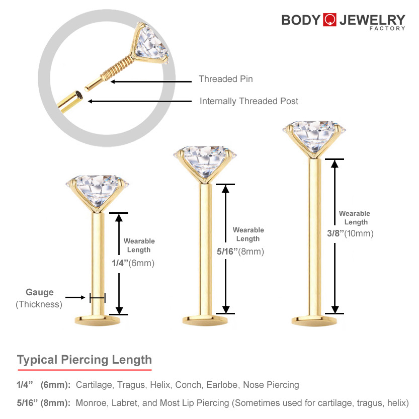 1/4" (6 mm): Fits most cartilage, tragus, helix, conch, earlobe, and nose piercings