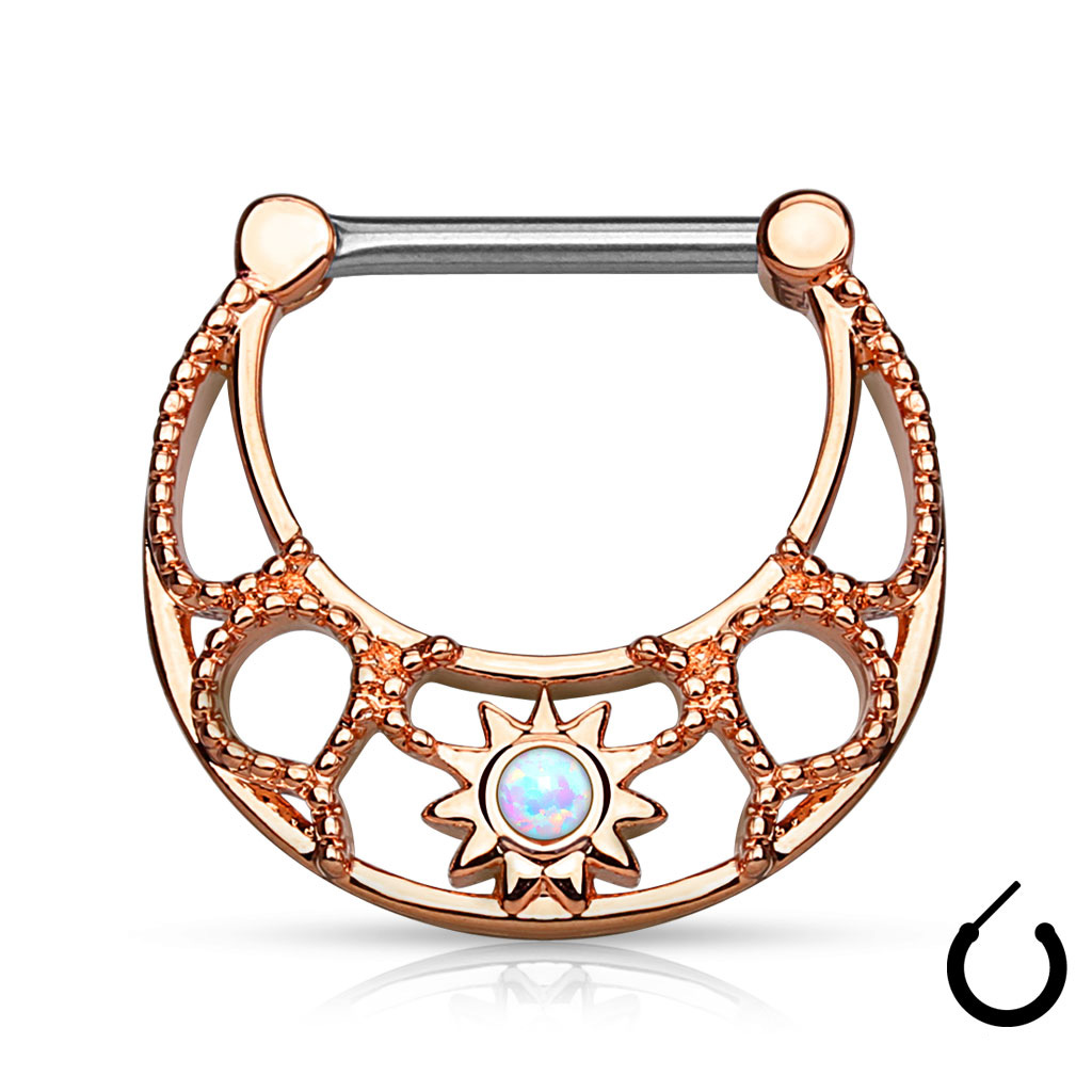 316L Surgical Steel14 Gauge 316L Opal Sunburst Rose Gold Nipple Clicker Ring PRODUCT DETAILSPrice Per Each (Items are sold individually. Select a quantity of 2 for a pair)Quick Open Clicker RingStandard 14 Gauge 1/2" Inner Diameter316L Surgical Stainless Steel Nipple Ring Jewelry