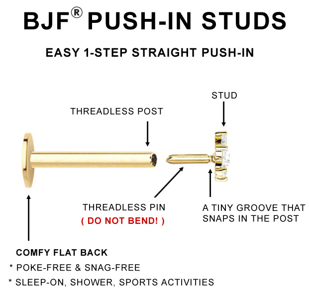 PRODUCT DETAILS![]() This dazzling and glamorous diamond cartilage stud earring features a total of three round brilliant-cut diamonds beautifully handcrafted in a shared prong-setting 14K solid gold. This versatile, elegant three-stone diamond cartilage earring is a perfect addition to your cartilage jewelry collection and makes the perfect gift for any occasion. This flat back single earring comes in 3 colors of 14k solid gold and secures with friction push-in post.